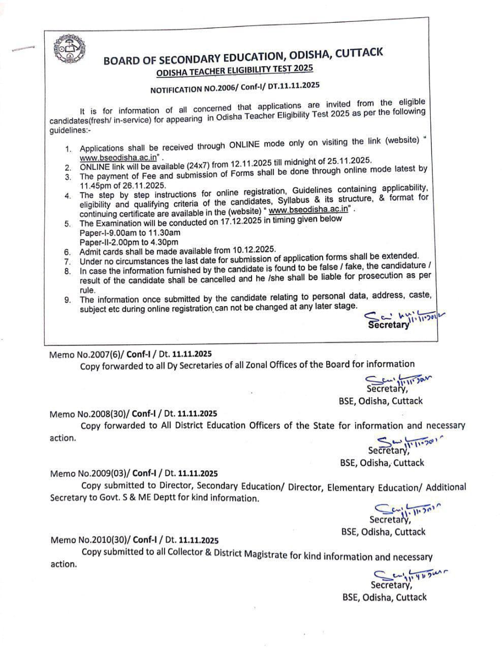 Board of Secondary Education has released short notification for Odisha Teacher Eligibility Test OTET 2025 Apply Date. Online Application starts from 12 November 2025 and closes on 25 November 2025.